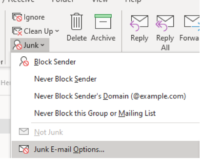 Whilst in the email you’ve received - from the main Outlook ribbon (usually top left) you can select Junk – Junk E-mail Options.